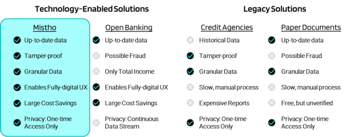 In this case, we define “verified” loosely as a check on data by legitimate providers such as credit reporting agencies, open banking and open payroll providers. By this definition, credit reporting agencies, open banking and open payroll providers are all able to verify the data through different means.